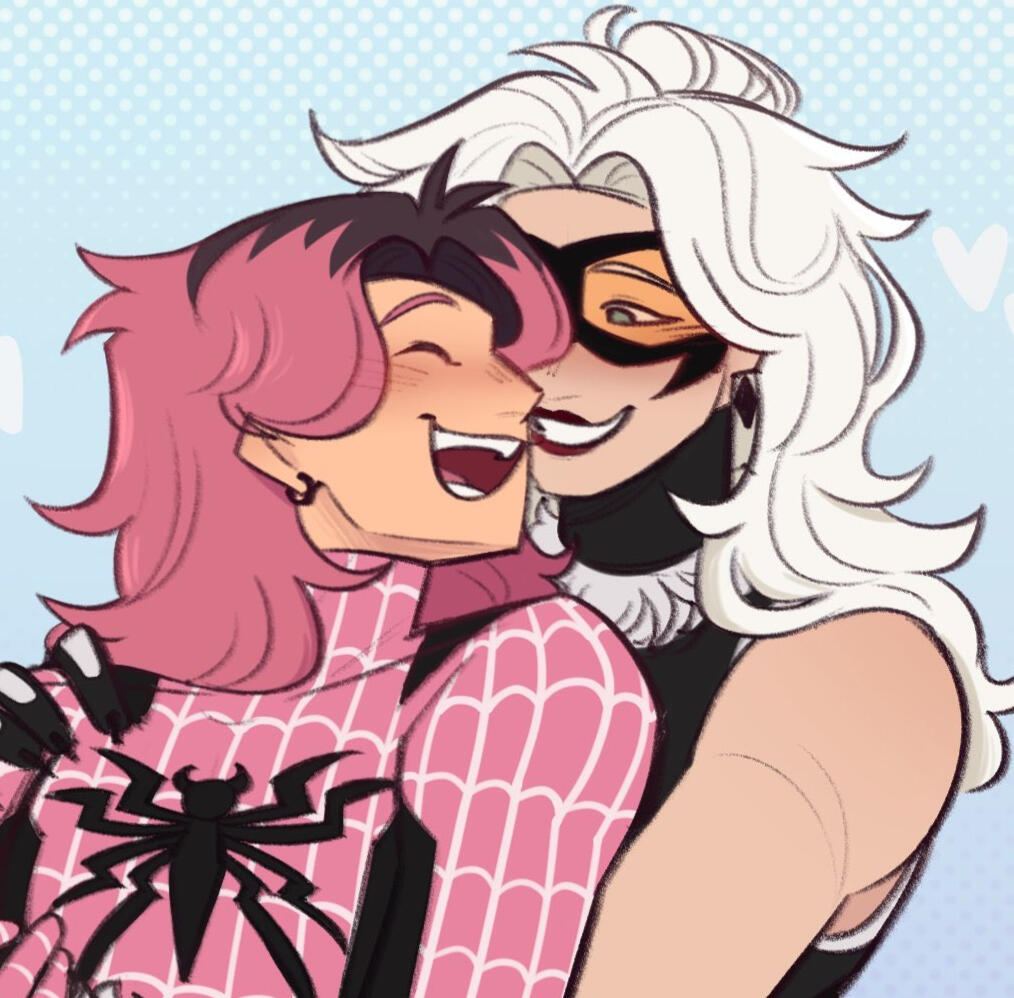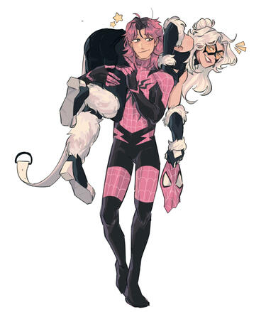 Luka and Felicia have an .. extremely complicated relationship. At first, it was best described as a "mutual feelings friends with benefits situationship". They both know it would be difficult to be together, because Felicia is the Black Cat, a thief, and Luka is another Spider, a hero, meaning they've been put against each other from the start. However, it's safe to say that life definitely had other plans for the two of them. While Felicia wasn't fond of the fact that she was tangling with another spider, she found herself quite infatuated with Luka at the beginning. The two of them crossed paths just barely three months after Luka had been bit. Their cat and mouse game had a good run, as Luka was determined to put the thief behind bars, but with every encounter and every failed attempt at stopping her, they found themself letting go of the fact that she was a "criminal". Even though encounters between the two grew a little scarce, Luka ultimately gave into their personal desires and let themself begin to have fun with Felicia. For the next three months the two began to develop a friendship, enjoying the thrill and time with each other. Luka began to let themself not be so righteous all the time, and Felicia decided it was about time she went a little straight. Eventually their friendship turned into something a little more, but still not enough. Their secret situationship had a good run before Felicia fled the city without any word or notice. Safe to say that Luka was more than a little heartbroken, and a bit angry, but as the days went by they tried not to let it get to them. About a month later, Felicia returned to New York. There was no notice before the two of them ran into each other again one night, and all anger that Luka had felt before was replaced with relief that she wasn't gone for good. While the reunion was a little awkward, both Luka and Felicia were just overall glad to be in each others presence again. They rekindled what they had before, and after a few platonic hangouts the desire the two of them held for each other took over. After that night filled with one too many stolen kisses, Luka realized that they couldn't do what they had done months ago again, and that it was now or never. They took the opportunity to confess, a little poorly if anything, but in the end it worked out for the better. Despite Felicia's own problems and insecurities, her love for Luka overpowered any other thought she had, and after that they two entered a relationship. While still a little rocky, the two of them are willing to do whatever it takes to make this work out.