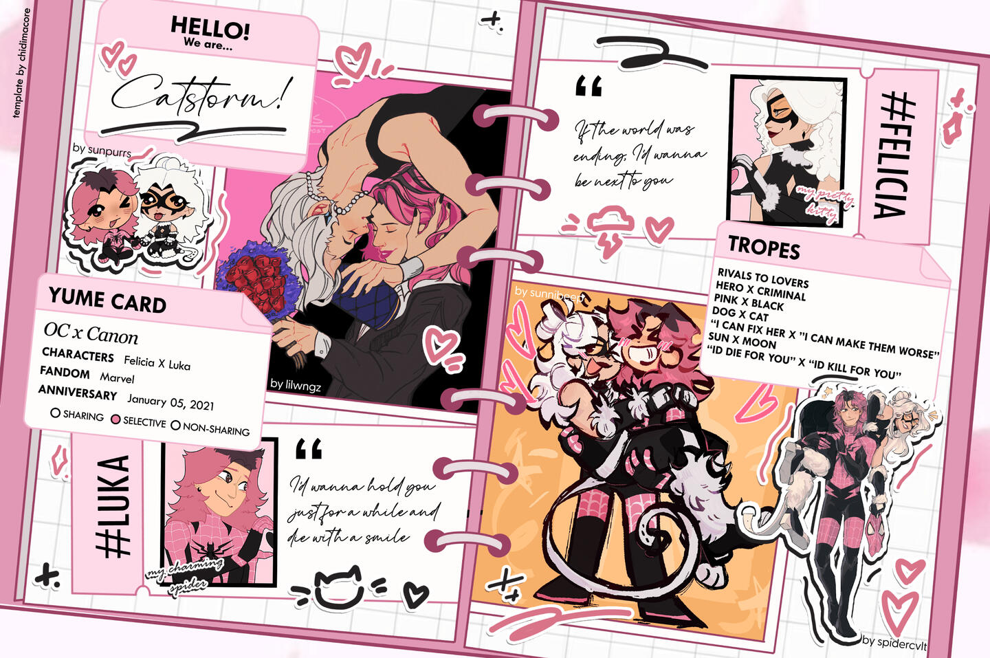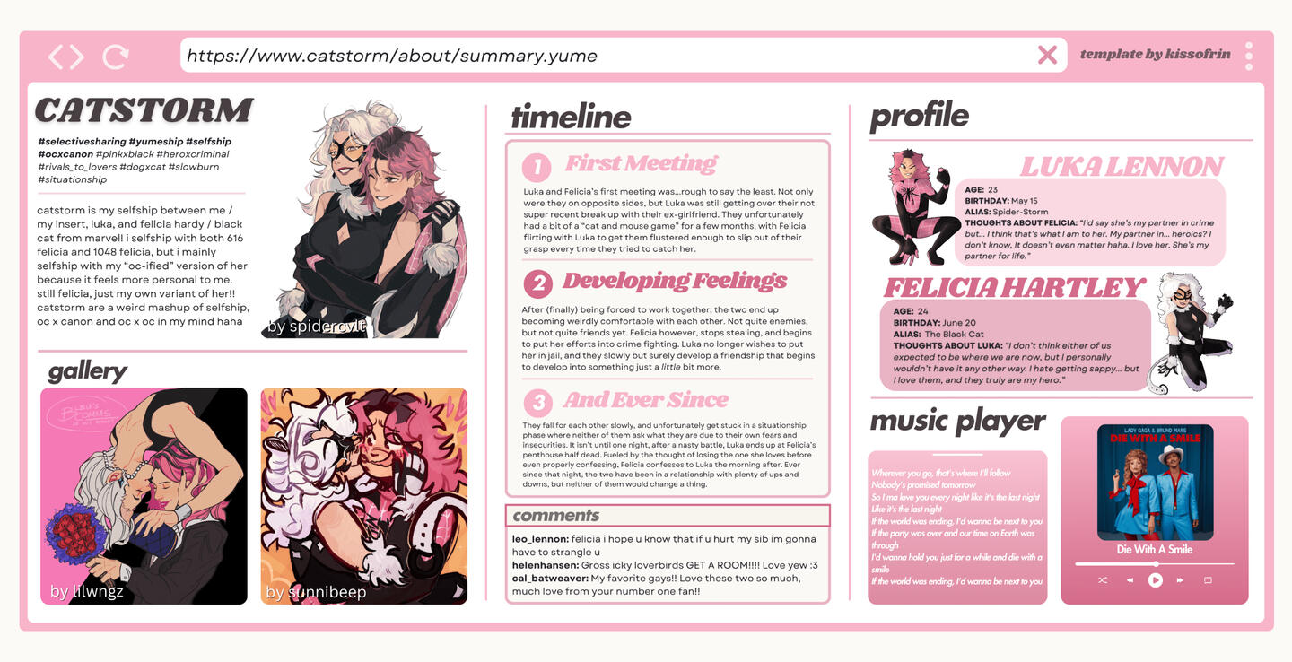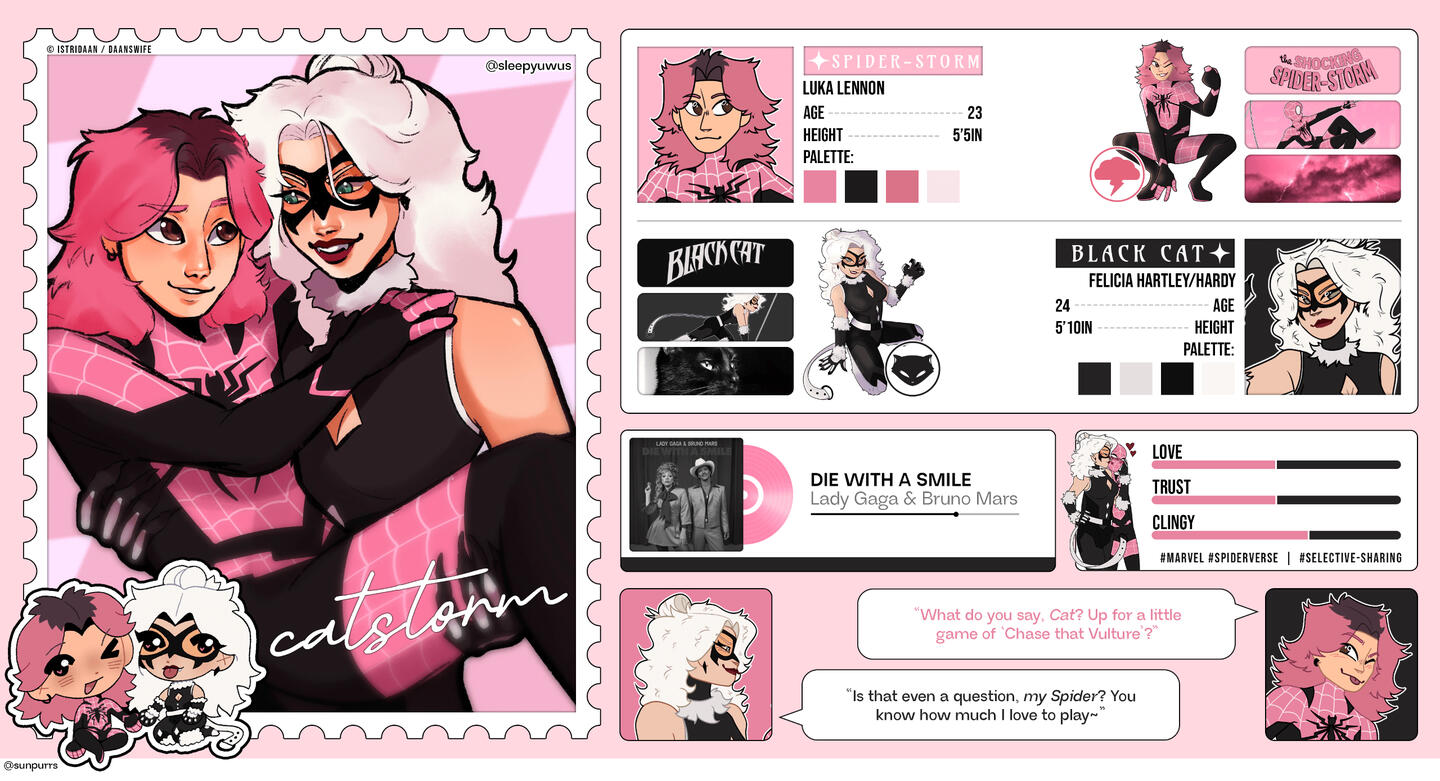 Catstorm is the selfship between my self insert sona, Luka, and Felicia Hardy of Marvel. While I personally see Catstorm as a selfship, because Luka is genuinely just an ideal version of myself, all of their lore is surrounding their characters rather than me as myself.I selfship with Felicia Hardy from Earth-616, Felicia Hardy from Earth-1048 (Insomniac gamerverse) as well as an "OC-ified" version of her where I've reshaped her character to fit my spidersona's universe. I often will put Catstorm into different AUs / Universes, and when I do I use my OC-ified version of her rather than either of the "canon" versions of her.Each of these three versions of Catstorm have different lore, which all found within this page.