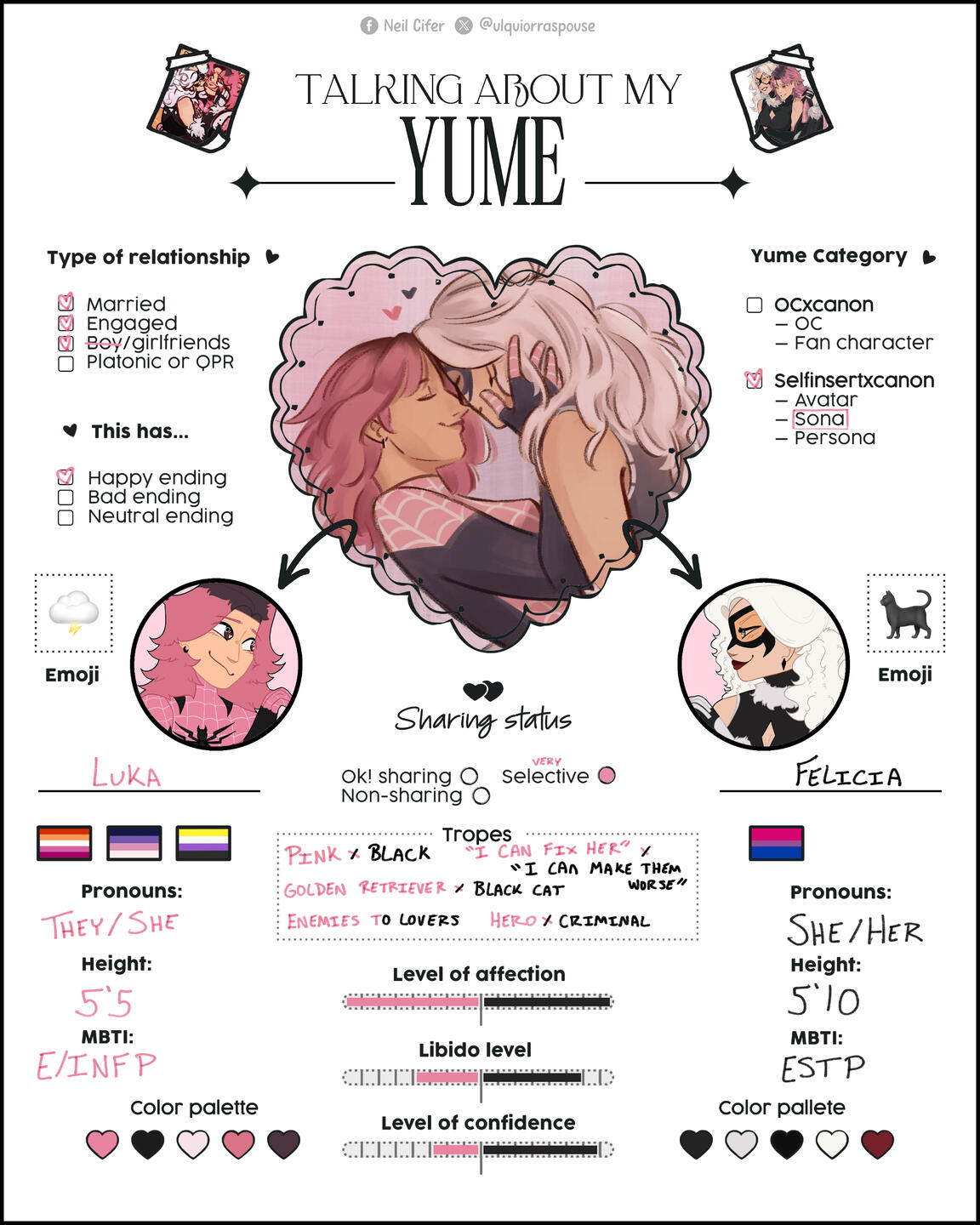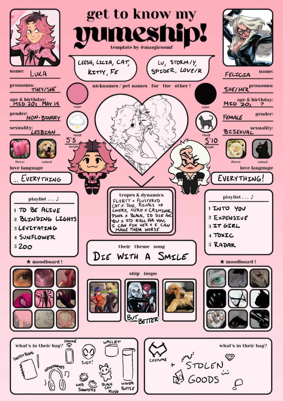 Luka and Felicia have an .. extremely complicated relationship. At first, it was best described as a "mutual feelings friends with benefits situationship". They both know it would be difficult to be together, because Felicia is the Black Cat, a thief, and Luka is another Spider, a hero, meaning they've been put against each other from the start. However, it's safe to say that life definitely had other plans for the two of them. While Felicia wasn't fond of the fact that she was tangling with another spider, she found herself quite infatuated with Luka at the beginning. The two of them crossed paths just barely three months after Luka had been bit. Their cat and mouse game had a good run, as Luka was determined to put the thief behind bars, but with every encounter and every failed attempt at stopping her, they found themself letting go of the fact that she was a "criminal". Even though encounters between the two grew a little scarce, Luka ultimately gave into their personal desires and let themself begin to have fun with Felicia. For the next three months the two began to develop a friendship, enjoying the thrill and time with each other. Luka began to let themself not be so righteous all the time, and Felicia decided it was about time she went a little straight. Eventually their friendship turned into something a little more, but still not enough. Their secret situationship had a good run before Felicia fled the city without any word or notice. Safe to say that Luka was more than a little heartbroken, and a bit angry, but as the days went by they tried not to let it get to them. About a month later, Felicia returned to New York. There was no notice before the two of them ran into each other again one night, and all anger that Luka had felt before was replaced with relief that she wasn't gone for good. While the reunion was a little awkward, both Luka and Felicia were just overall glad to be in each others presence again. They rekindled what they had before, and after a few platonic hangouts the desire the two of them held for each other took over. After that night filled with one too many stolen kisses, Luka realized that they couldn't do what they had done months ago again, and that it was now or never. They took the opportunity to confess, a little poorly if anything, but in the end it worked out for the better. Despite Felicia's own problems and insecurities, her love for Luka overpowered any other thought she had, and after that they two entered a relationship. While still a little rocky, the two of them are willing to do whatever it takes to make this work out.