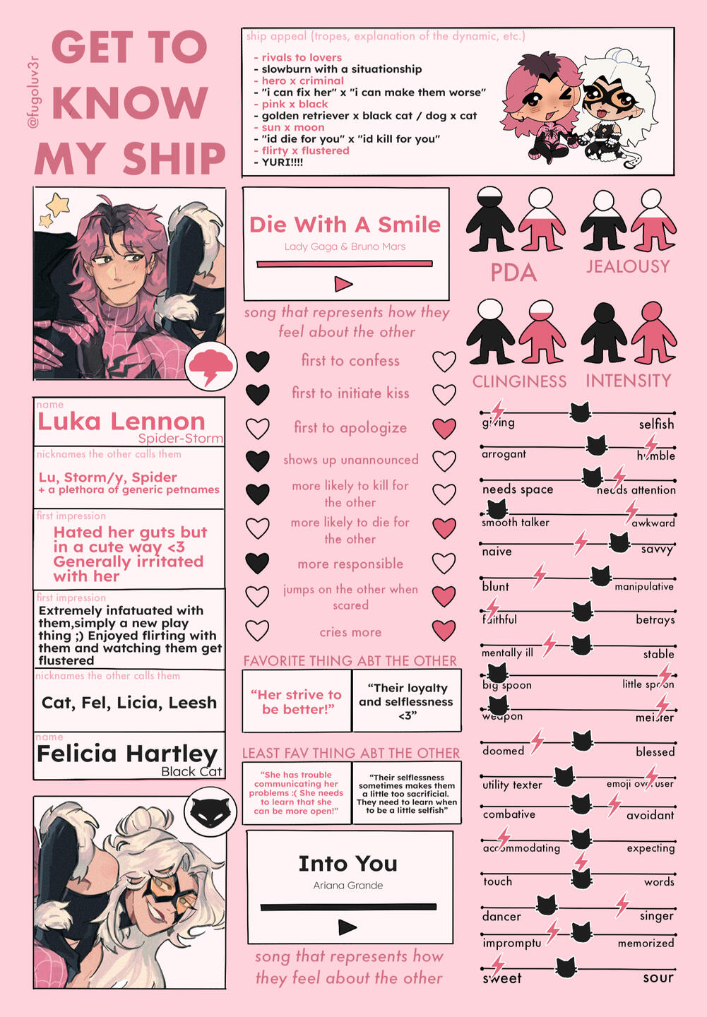 TROPES: rivals to lovers, slowburn with a situationship, hero x criminal, "i can fix her" x "i can make them worse", pink x black, golden retriever x black cat / dog x cat, sun x moon, "id die for you" x "id kill for you", flirty x flustered, YURI!!!!THEME SONG: Die With A Smile - Lady Gaga & Bruno Mars