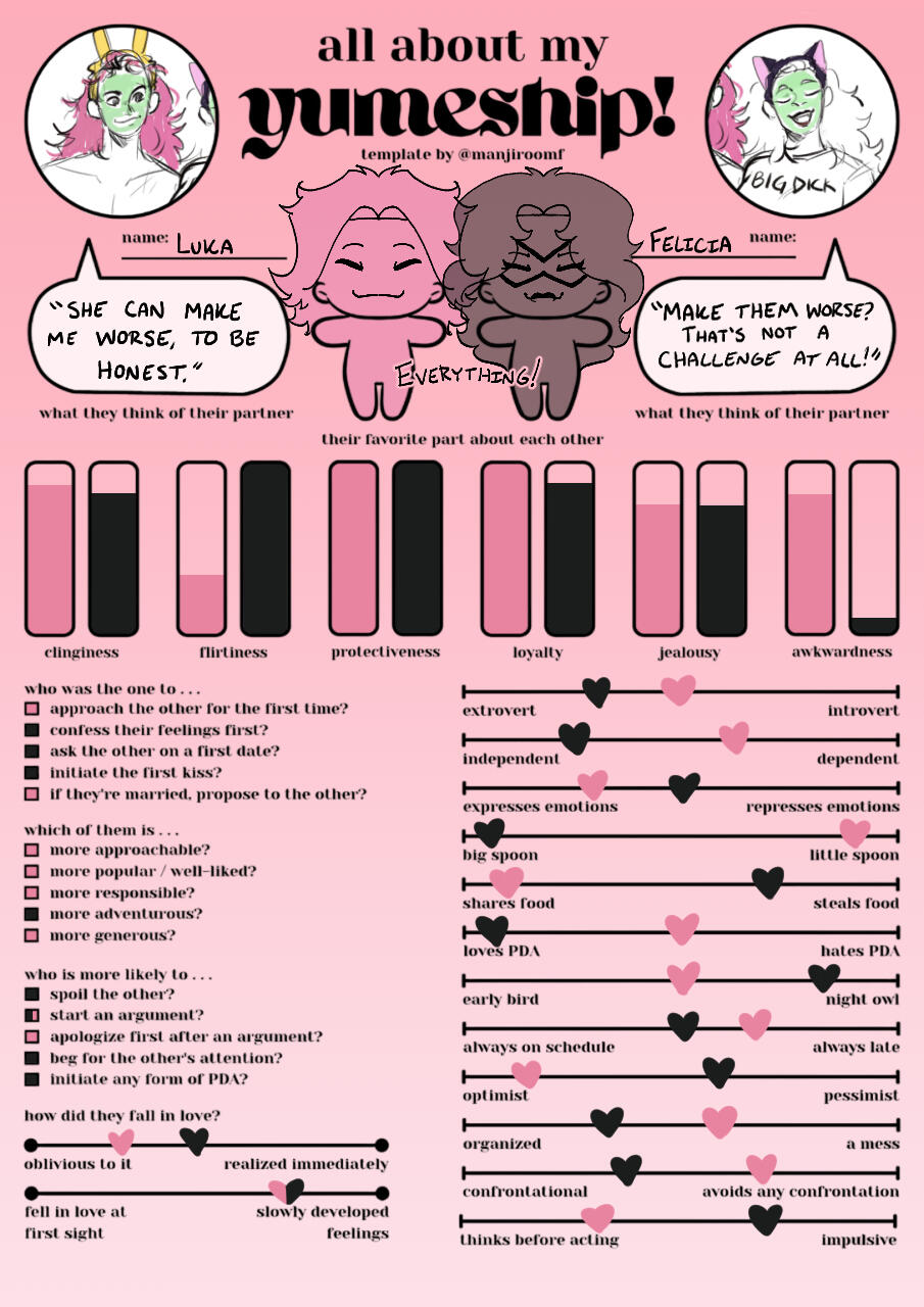 (WIP) Complicated insane relationship. Kinda toxic for a bit, very on and off because of different morals and views. Luka feels as if they need to be insanely righteous and that every wrongdoer needs to be incarcerated. However, over time, Luka realizes that everything isn't just black and white. While they still feel as if they're a "hero", after meeting Felicia and getting caught in her game, they start to become a bit more grey. Luka and Felicia end up changing each other for the better(?), with Luka becoming less lawful, and Felicia going a bit more straight.